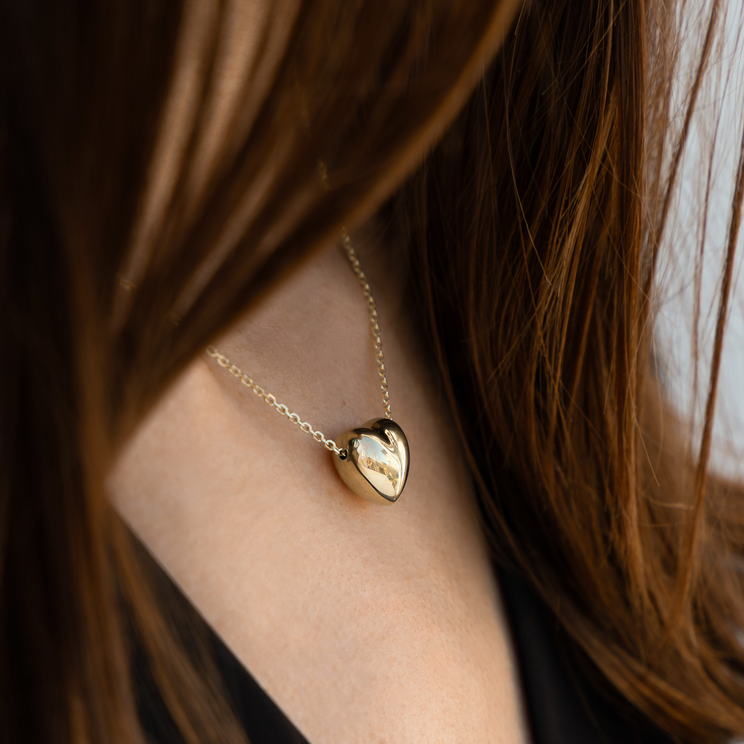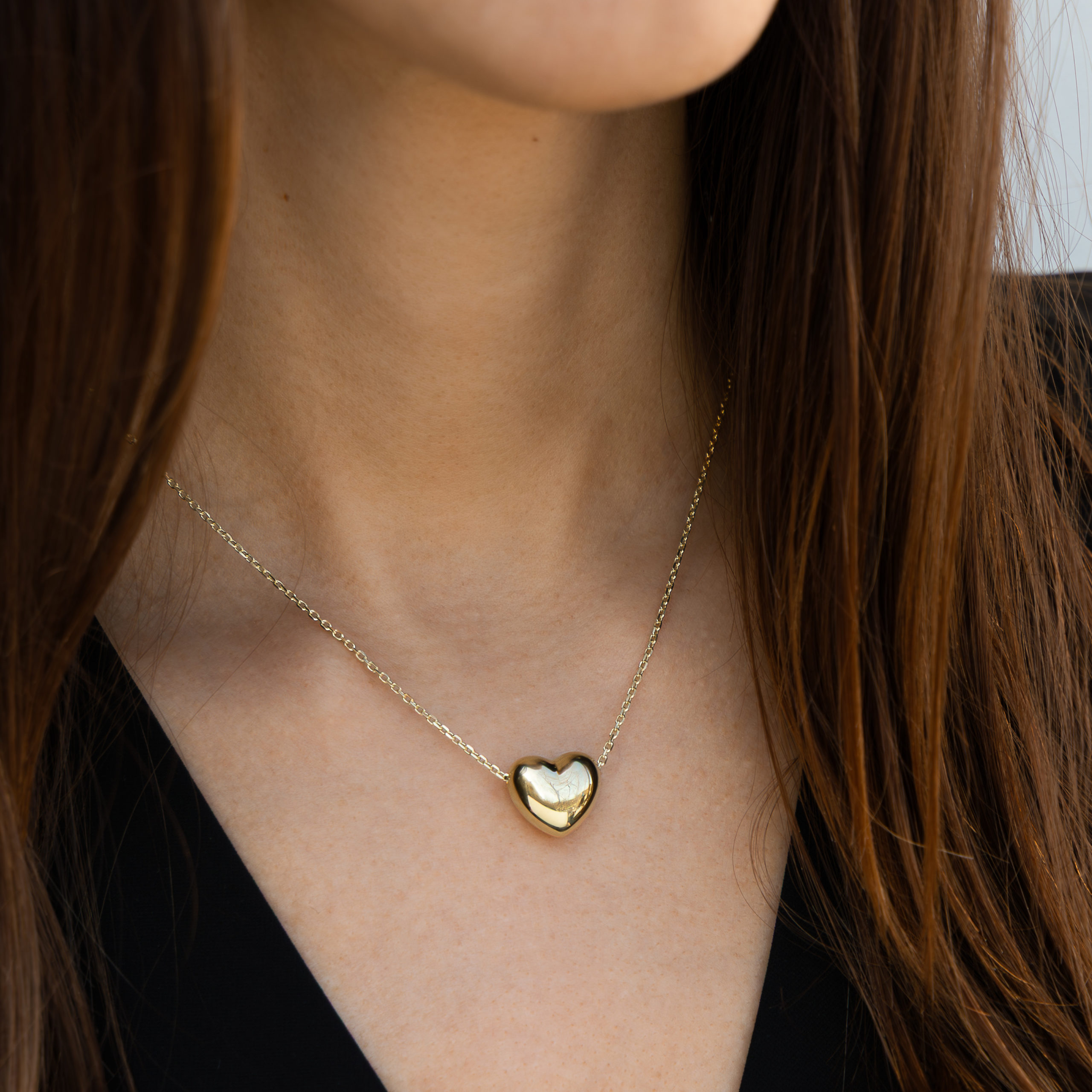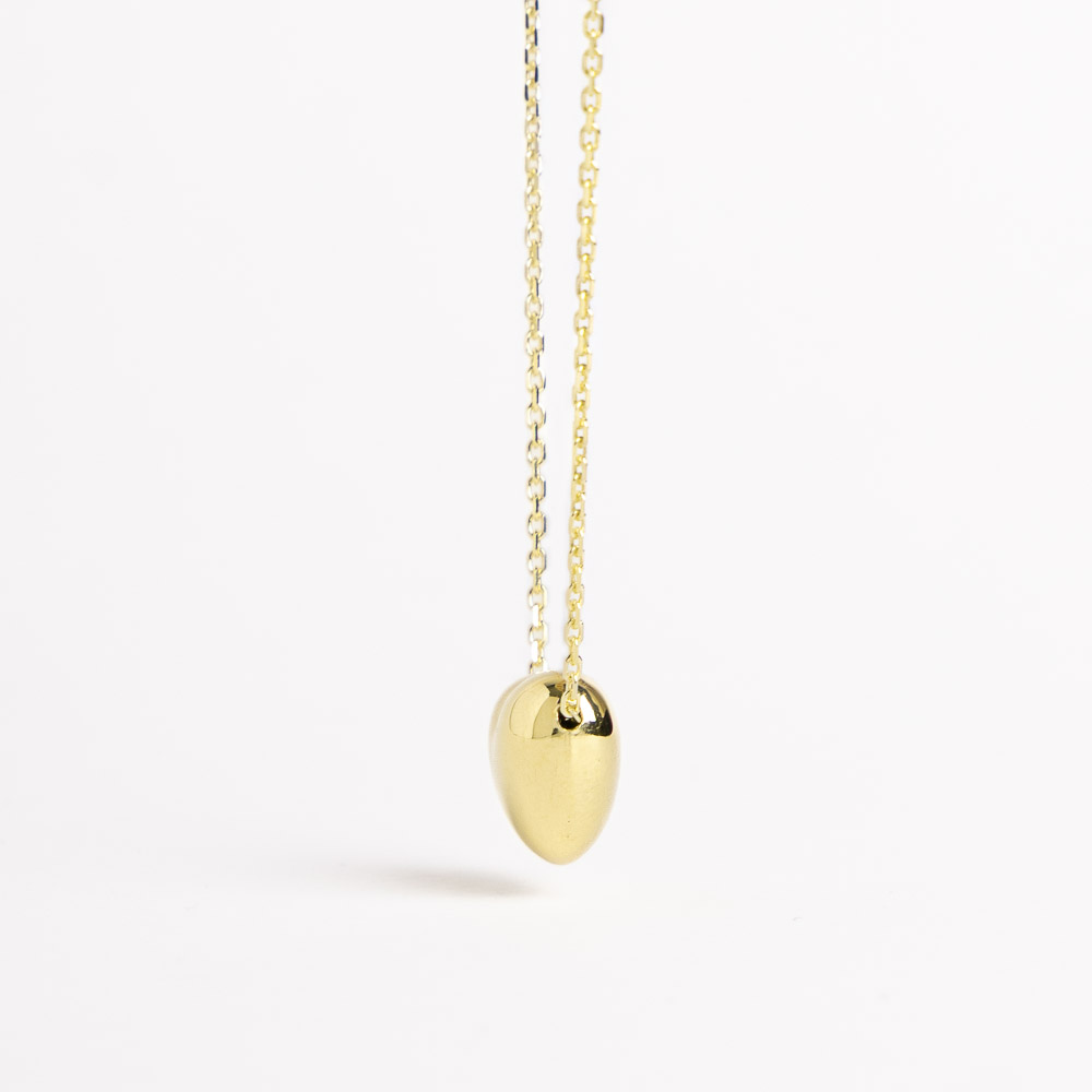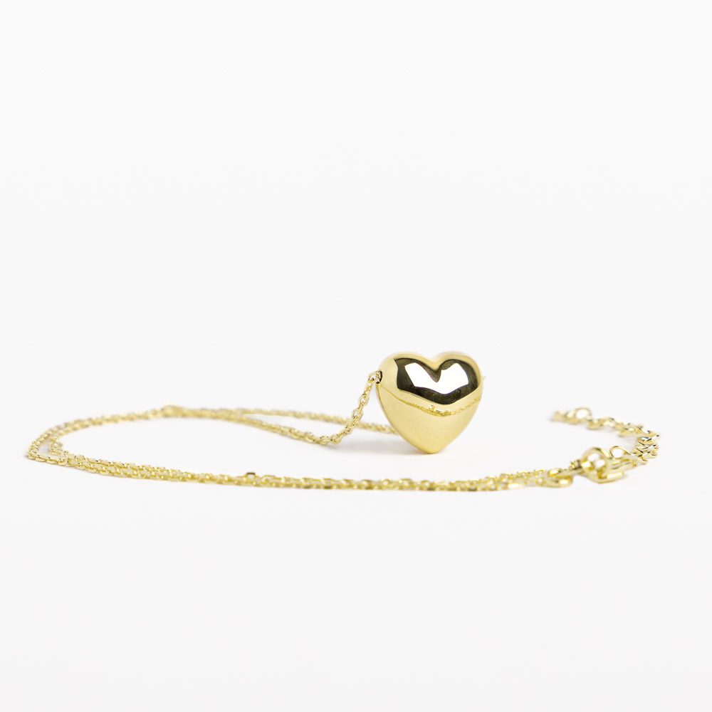 Questo collier è impreziosito da un ciondolo passante a forma di cuore bombato dalla superficie liscia e dorata. La catena forzatina diamantata, regolabile e luminosa, accompagna con naturalezza ogni décolleté.