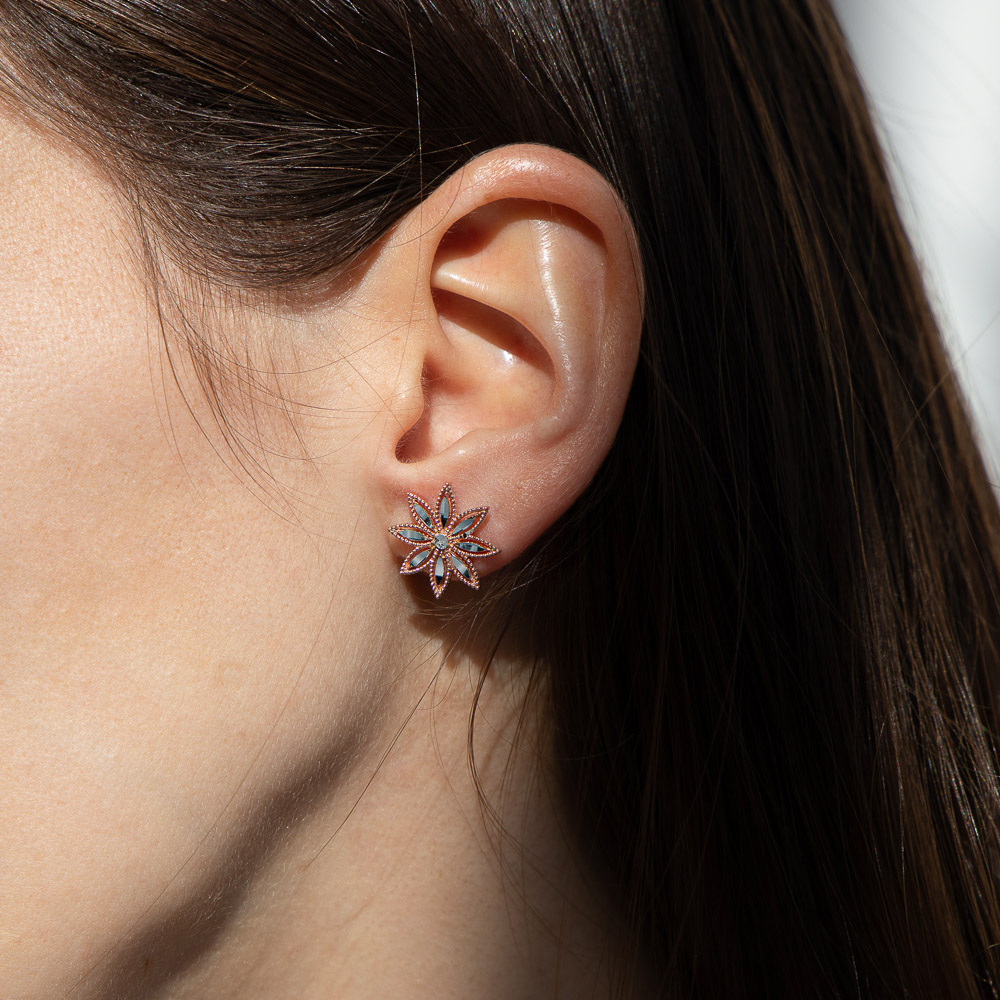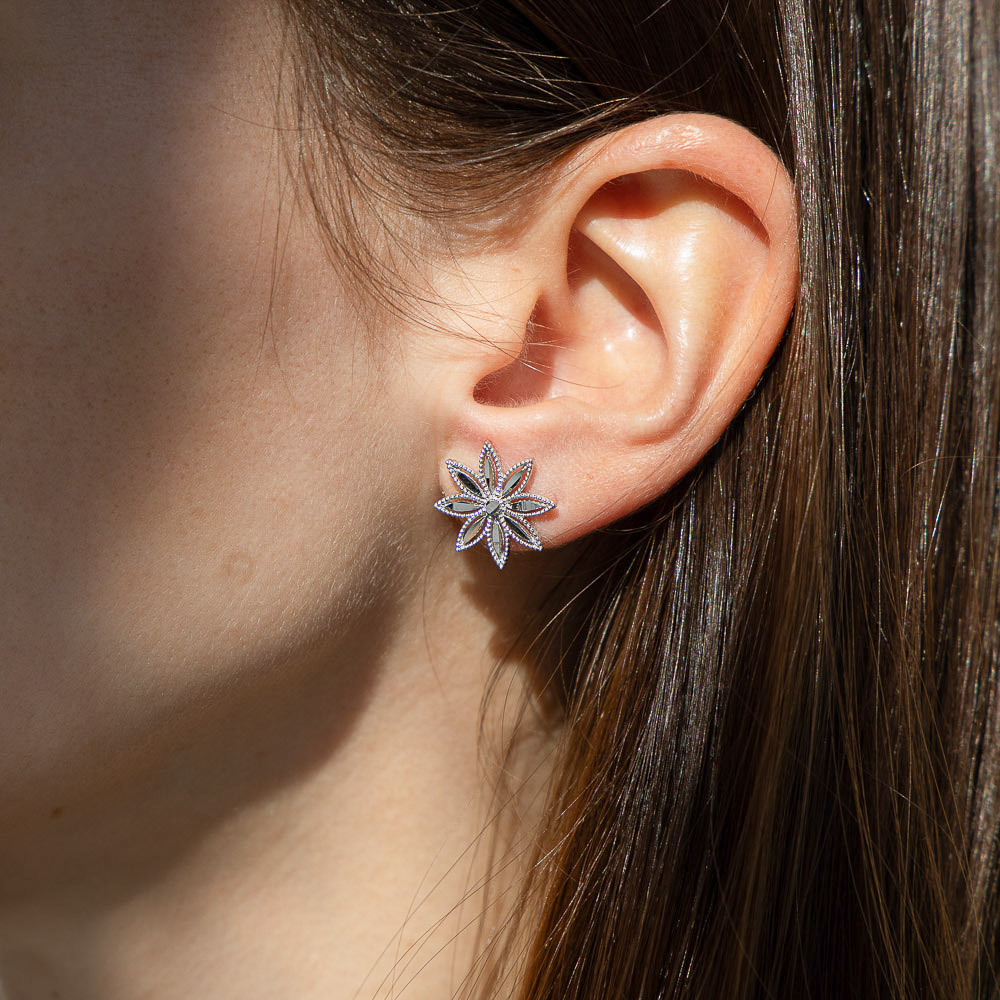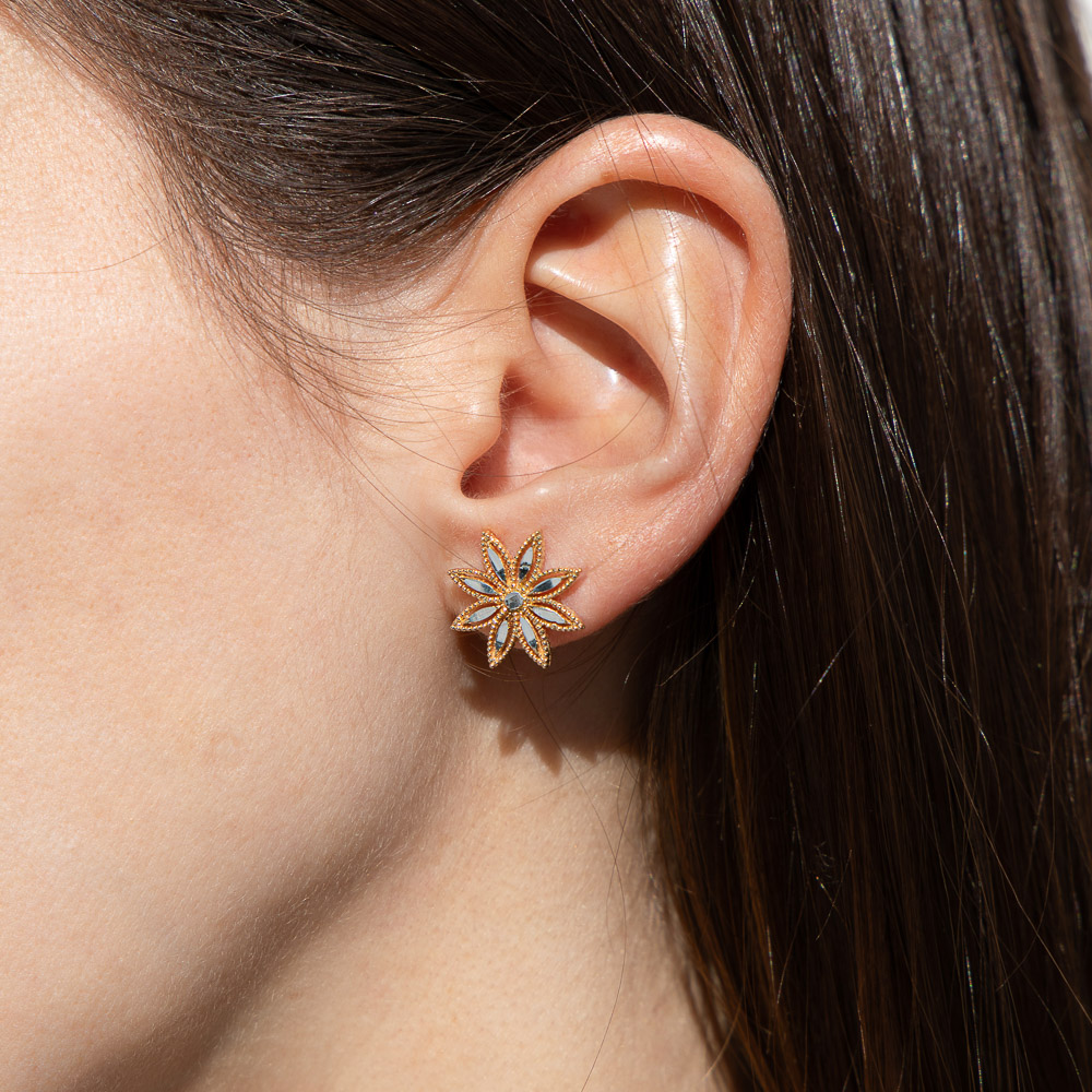 Questi orecchini a lobo celebrano la primavera attraverso la forma delicata di un fiore a otto petali. Ogni petalo è impreziosito da elementi diamantati, applicati e rifiniti a mano, che donano luce e valorizzano i dettagli della lavorazione.