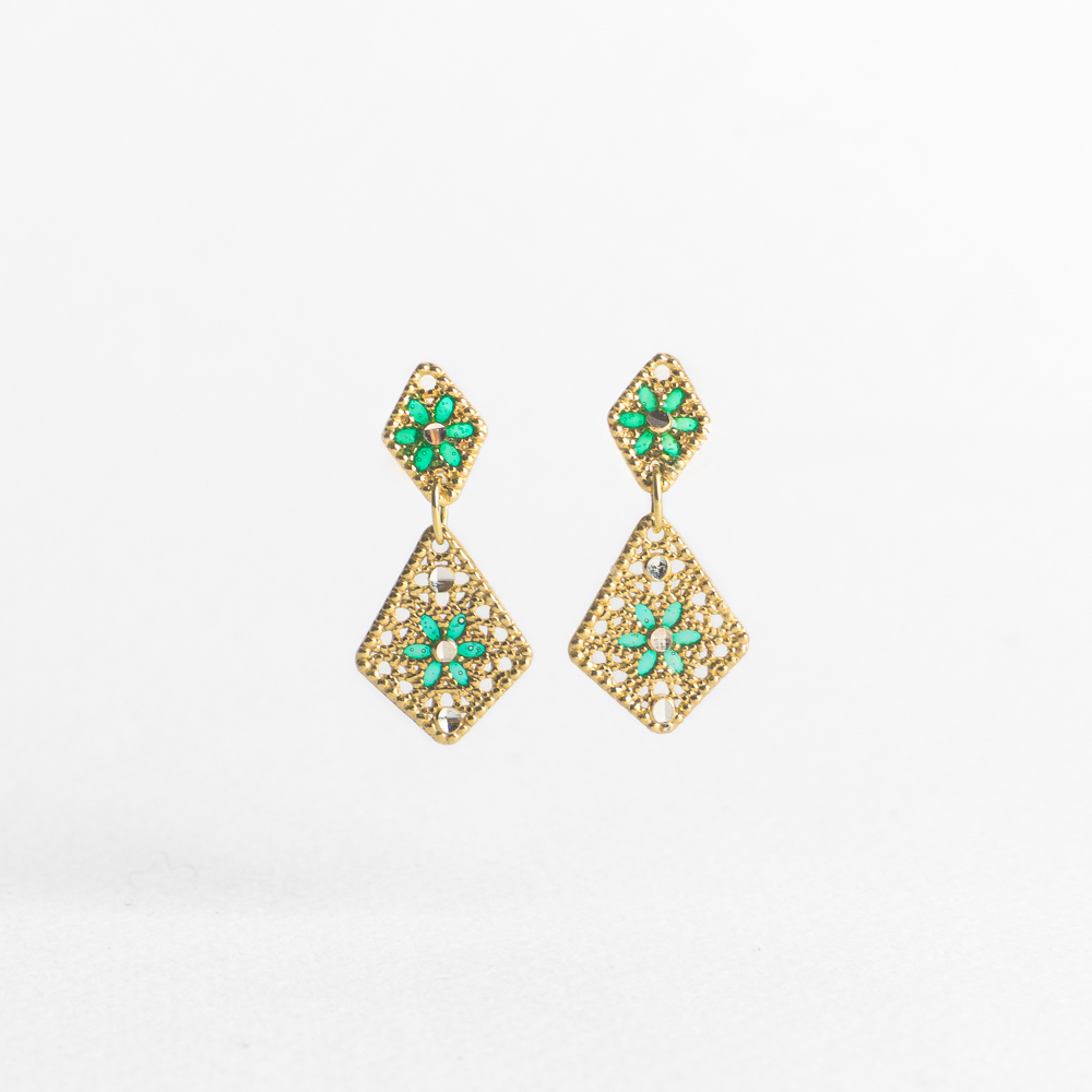 Orecchini pendenti con doppio elemento a forma di rombo, caratterizzati da una trama diamantata incisa a mano. Al centro, eleganti fiori in smalto trasparente che richiamano la luminosità e la magia dei vetri di una cattedrale. Piccoli e leggeri, questi orecchini in argento sono una meraviglia artigianale.